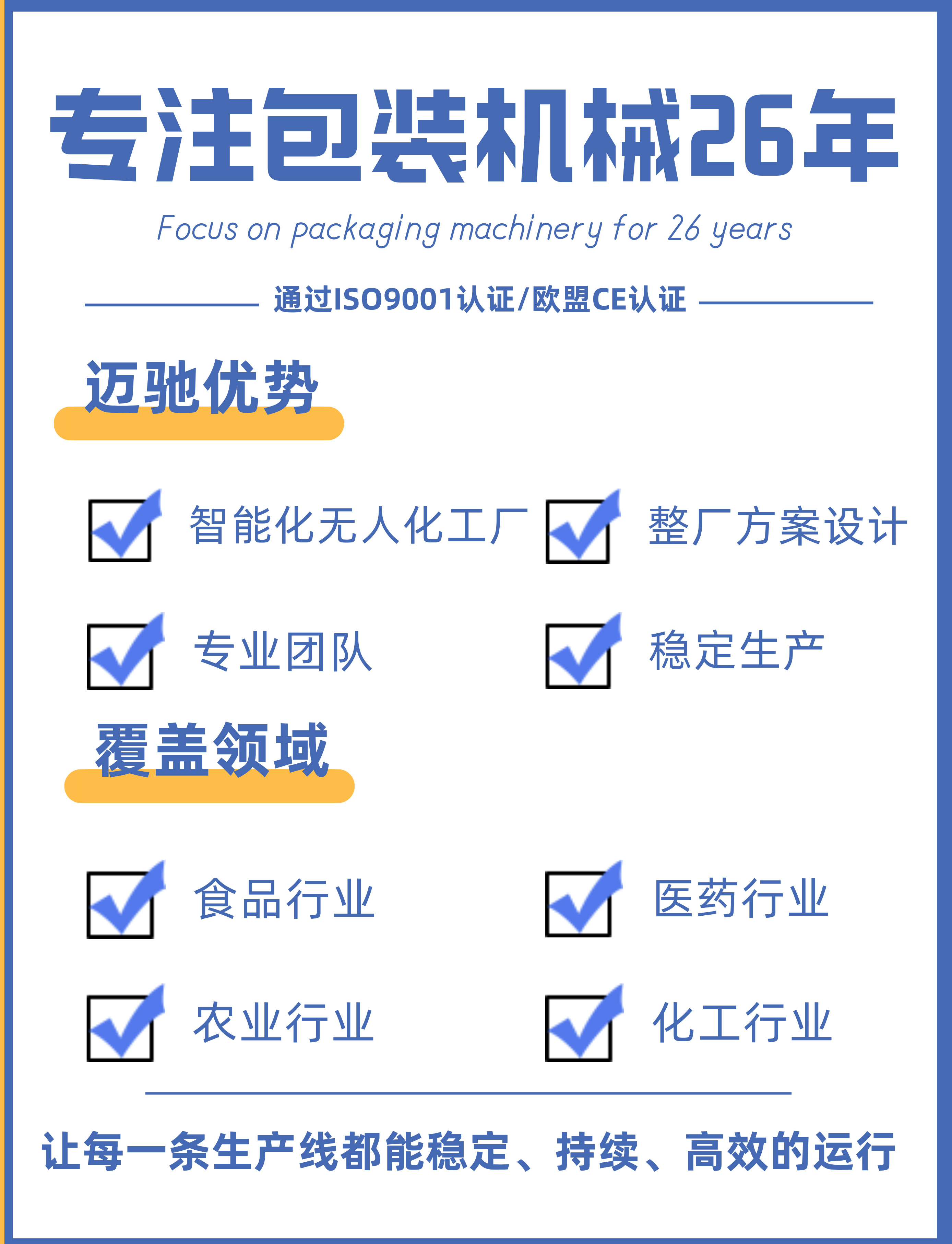 邁馳是一家專業(yè)生產(chǎn)全自動(dòng)多列粉劑、粉末包裝機(jī)整線廠家,可根據(jù)客戶不同物料特性定制一對(duì)一方案,可根據(jù)產(chǎn)量定制列數(shù)-有序理料裝盒-自動(dòng)裝箱-機(jī)器人碼垛。整廠方案設(shè)計(jì)...
